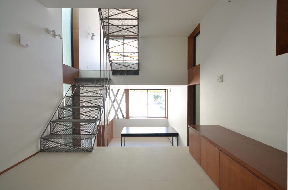 ここでは、要望スペースの関係性を紐解き、隣接可能なスペースの面積を調整しながら半階ずらしつつ縦に並べるスキップフロア構成を採用した。耐火建築が求められる敷地条件だったが地盤が良好でなかったため比較的軽量な耐火木造とし、道路側は間口いっぱいの開口部を各階の必要光量やプライバシーの度合いに合わせて確保し、導いた光や風を建物内にいきわたらせる様にスキップフロアを構成する階段を透過性のあるメッシュ階段とした。またその階段は上下階の移動手段であると同時に床同士をつなぐ構造体であり、階段の幅に変化をつけ大階段や飾り棚としても機能させた。